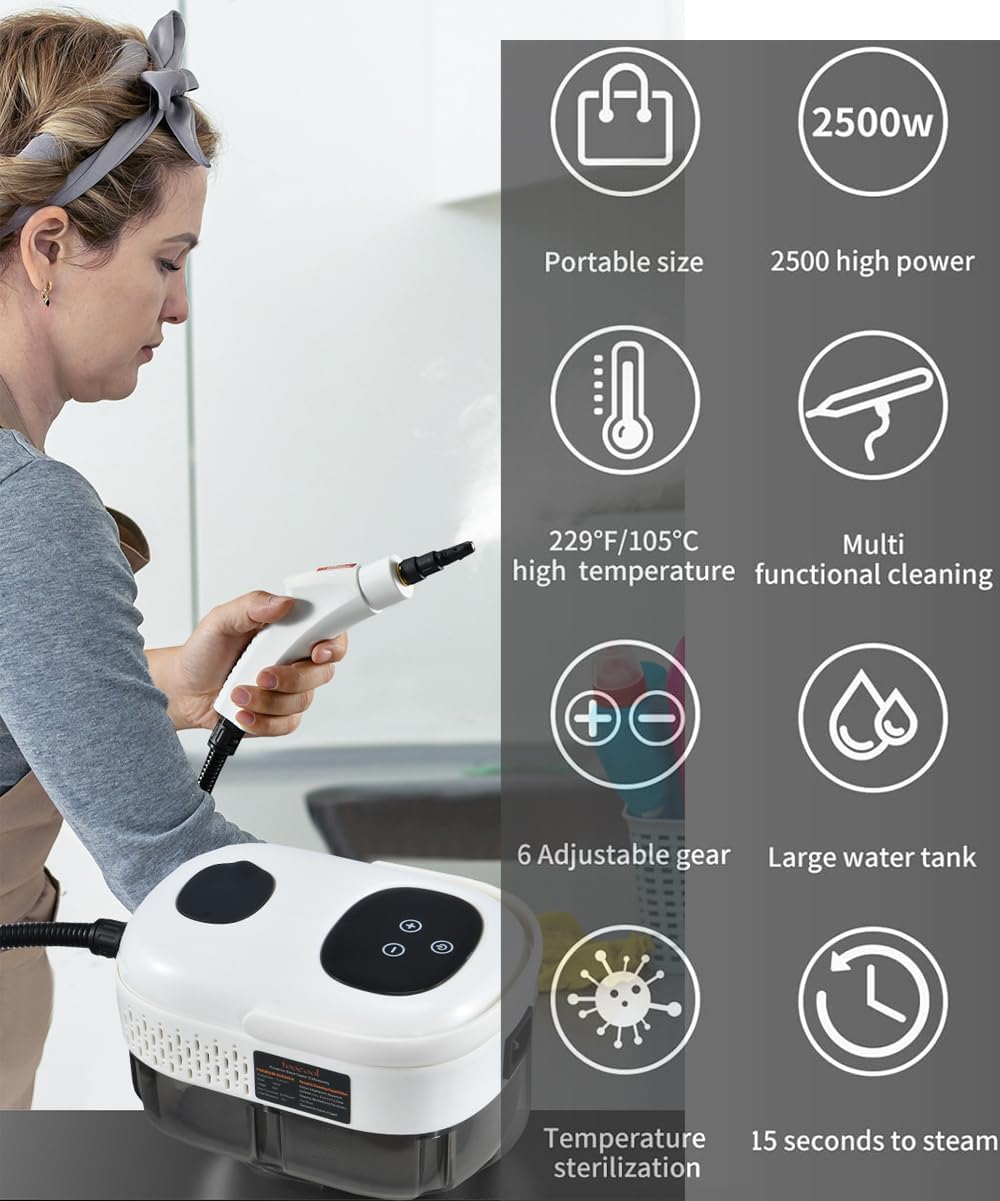 Powerful Steam Cleaning: Generates 4.5Bar pressure and reaches 105℃ (221℉) in just 15 seconds with its 2500W motor, effectively removing tough stains and grease.