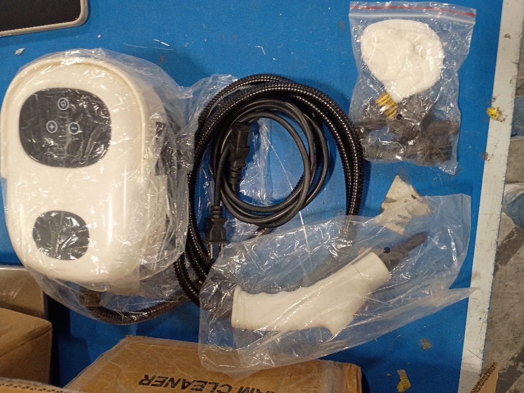 Handheld Steamer Cleaning Kit: Includes a high-pressure steam cleaner, glass wiper, extension pole, large round brush, high heat nozzle, steel brush, nylon brush, cloth cover, power cord, and user manual.