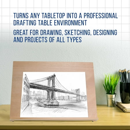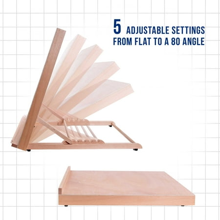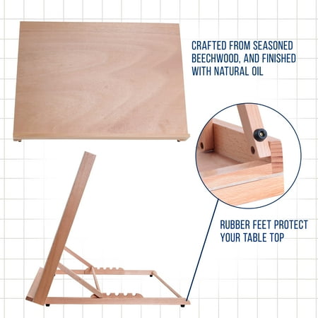 Extra Large Working Area of 25-5/8" Wide x 19" Tall Beautifully hand crafted from seasoned beechwood, and finished with natural oil 5 Adjustable settings from flat to a 80 angle so you can find your perfect drawing angle and comes with a sturdy pencil holding ledge