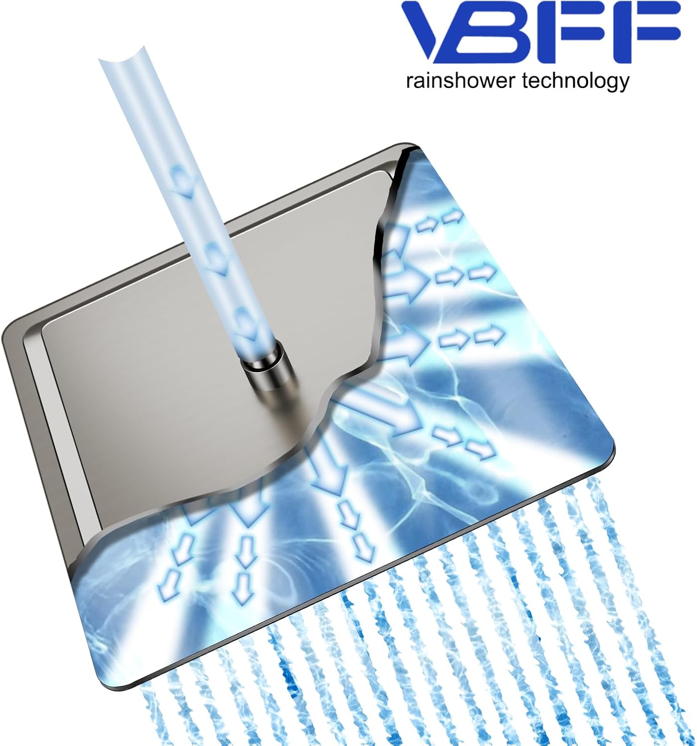 【Stylish and High-Quality Shower Head】Unlike many cheap plastic showers available on Amazon, the VBFF 16-inch wide designer rain shower is made of 100% heavy-duty solid stainless steel, ensuring durability and the highest rust resistance. Its surface features a matte Black finish, adding a beautiful touch to your bathroom decor.