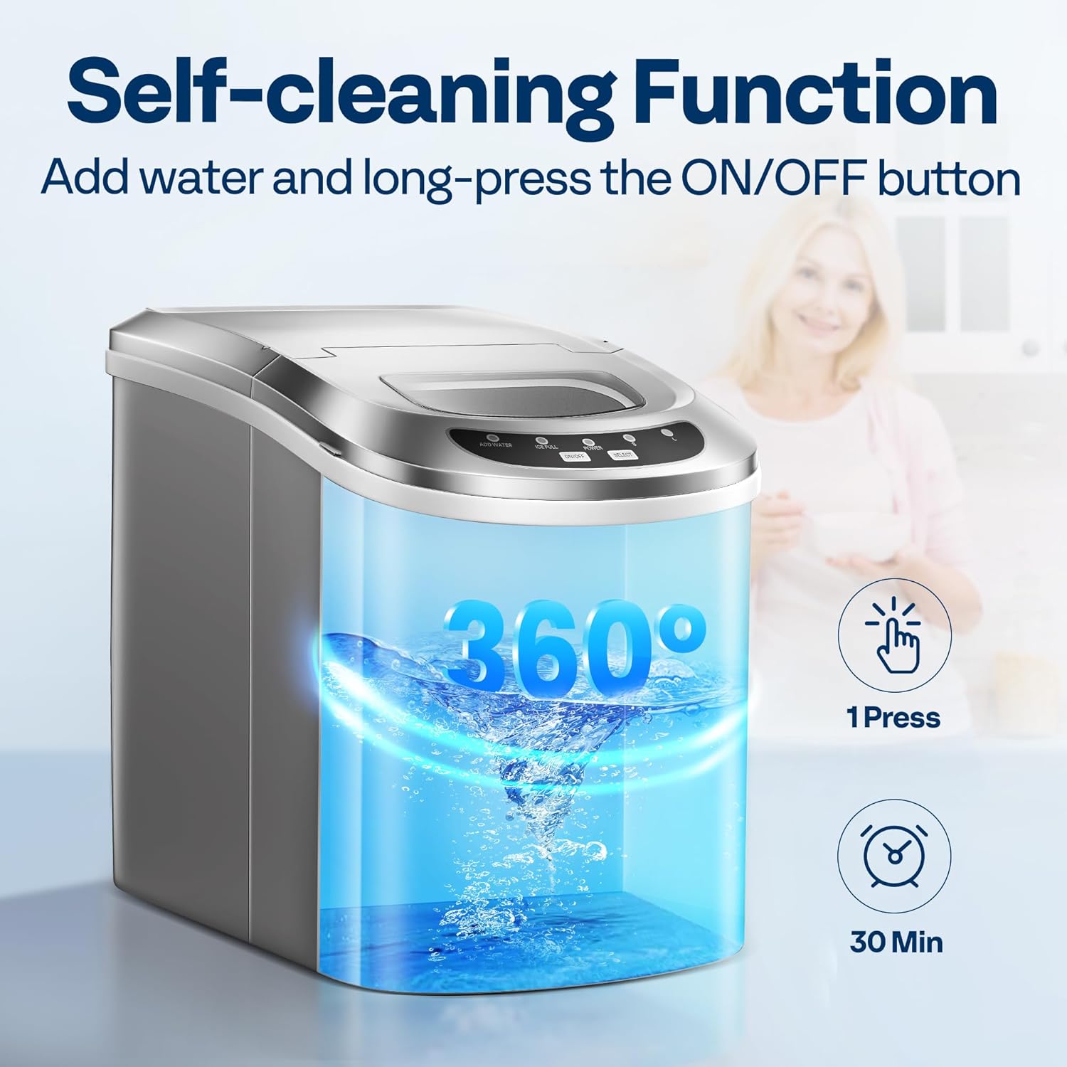 SELF-CLEANING FUNCTION - With the self-cleaning ability, you only need to add water to the sink and long-press the ON/OFF button for 5 seconds, then the machine starts to auto-clean; The cleaning time is about 30 mins and then it will stop working, you can open the small rubber stopper at the bottom and drain the dirty water out of the machine; The cleanser for exclusive use is also suitable for the self-clean system of this machine, but only be needed for every half year or 1 year a time