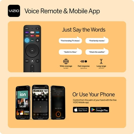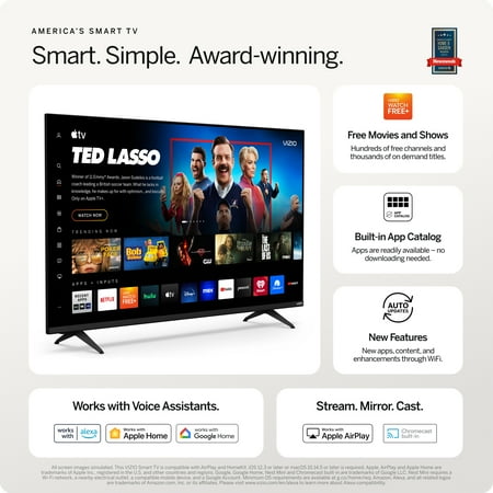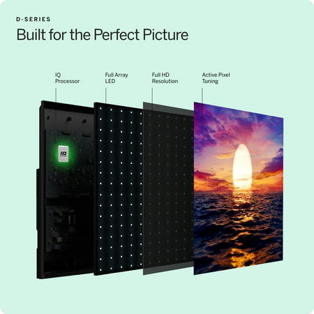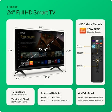 VIZIO 24" Class D-Series FHD LED Smart TV (Online Only) D24fM-K01 Full HD Picture Perfection - Full HD Picture Perfection gives you crystal-clear, award-winning picture quality. Contrast and brightness are achieved with Full Array LED Backlight and fine-tuned at a granular level with Active Pixel Tuning. America’s Smarter TV - Instantly access millions of titles with America's Smarter TV. Your favorite apps, shows, movies, news, sports, music and over 250 free streaming channels on WatchFree are pre-loaded into every VIZIO TV. Free TV Lives Here - Save on cable bills and stream for free with VIZIO WatchFree . Built-in to every new VIZIO TV, WatchFree gives you 250 live streaming channels and over 5,000 titles on demand. No subscriptions, logins, or fees. Powerful Performance - The VIZIO D-Series has the horsepower for powerful performance. Superior picture processing, ultra-quick app navigation and reduced load times are powered by the IQ Picture Processor. Search. Discover. Enjoy. - Browse your favorite apps and easily search and discover content with one click from your home screen. Even easier? Just say the words and the included VIZIO Voice Remote and free mobile app will do the work. Dual-Band Wi-Fi 5 802.11ac - VIZIO IQ Processor with Dual-Band WiFi 5 seamlessly connects to your home internet faster for exceptional speeds when streaming and launching your favorite shows. Game On - PC or Console Ready - Get ready for next-gen gaming with AMD FreeSync, ultra-low input lag, VRR to reduce screen tearing, and NEW HDR gaming. Game Mode automatically powers on when a console or PC is detected. Bluetooth Headphone Capable - Pair your favorite Bluetooth headphones and hear every word – uninterrupted – while streaming VIZIO’s built-in apps and free channels. VIZIO Mobile App - Download the free VIZIO mobile app and control your TV or access your favorite apps right from your phone. Smart Home Ready - Control your TV with your voice using Apple HomeKit and Google Assistant. With built-in Apple Airplay and Chromecast, you can share or mirror anything from your laptop, phone, or tablet directly to your TV. Auto Updates - Supported VIZIO TVs will automatically update through WiFi, with the latest apps, free channels, new features, and more. ThinFrame Design - Minimal design. Maximum entertainment. The modern 3-sided ThinFrame design fits beautifully in any room. Enhanced Audio - Experience immersive sound through high-performance DTS-HD Audio coupled with DTS Virtual:X and Dolby Atmos pass-through. Better Together - VIZIO sound bars are made to integrate seamlessly with your VIZIO TV. When paired, the new integrated sound bar menu activates which allows you to easily adjust sound bar settings from your screen.