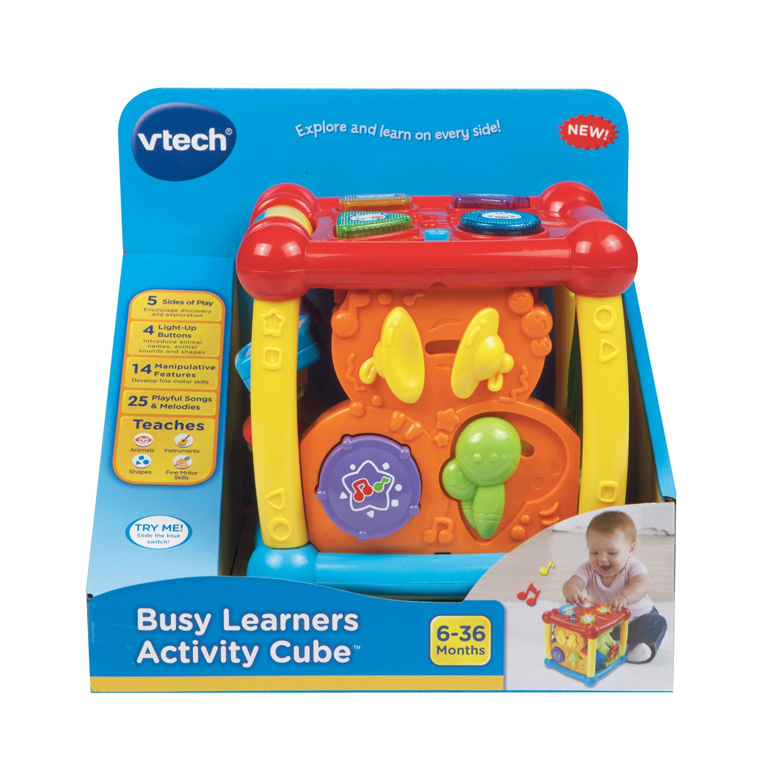 Featuring interactive activities, this busy learners activity cube by VTech. PRODUCT FEATURES 5 sides encourage discovery and exploration 4 light-up buttons introduce animal names, sounds and shapes 14 interactive features develop fine motor skills Motion sensor activates sounds 25 songs and melodies Parent-friendly features such as quiet play, durable design, and automatic shut-off PRODUCT DETAILS 9.49'H x 9.84'W x 7.01'D Age: 6 - 36 months Uses 2 AA batteries (included) Assembly required Promotional offers available online at Kohls.com may vary from those offered in Kohl's stores.