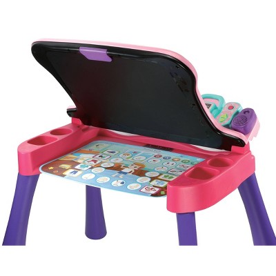 Learn and create with the Explore and Write Activity Desk™! This interactive desk features five activity pages filled with engaging content including letters, numbers, music, colors and more. The fold-down writing pad and light-up display encourage kids to practice writing by tracing letters, numbers and shapes with a stylus. The desk transforms into an easel and chalkboard with plenty of storage space for art supplies. Continue the play with expansion packs that each focus on a specific curriculum like nursery rhymes, reading skills, animals and numbers. Kids can also play with the touchscreen toy phone or listen to more than 20 melodies on the music player. (Art supplies not included. Expansion packs sold separately.) Intended for ages 2–5 years. Maximum weight 75 pounds. Requires 4 AA batteries. Batteries included for demo purposes only. New batteries recommended for regular use.