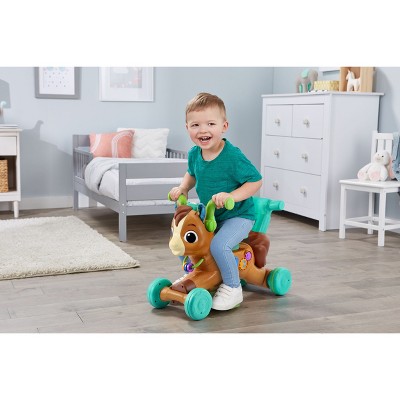 Get ridin' with this bouncing pony, only at Target! We know some days can feel like a toddler rodeo at home, so why not give your kiddo a pony to harness all that energy? This 4-in-1 pony goes from push walker to ride-on to scooter to galloping bouncer. It'll be a blue-ribbon winner in your child’s playroom! Give a loose rein to their imagination with five pretend places to visit—the beach, the mountains, the park, farm or school. Yee-haw! When your little one’s legs need a rest, there’s plenty to keep their mind and fingers busy. They can explore gears, clacker beads and a roller, or lift the peek-a-boo door to meet an animal friend. Hear about colors, numbers and shapes with the colorful light-up buttons kids love to press. Giddy-up, gallop and go! There’s a whole lot of playtime ahead! Intended for ages 12–36 months. Maximum weight 42 pounds. Requires 2 AA batteries. Batteries included for demo purposes only. New batteries recommended for regular use.
