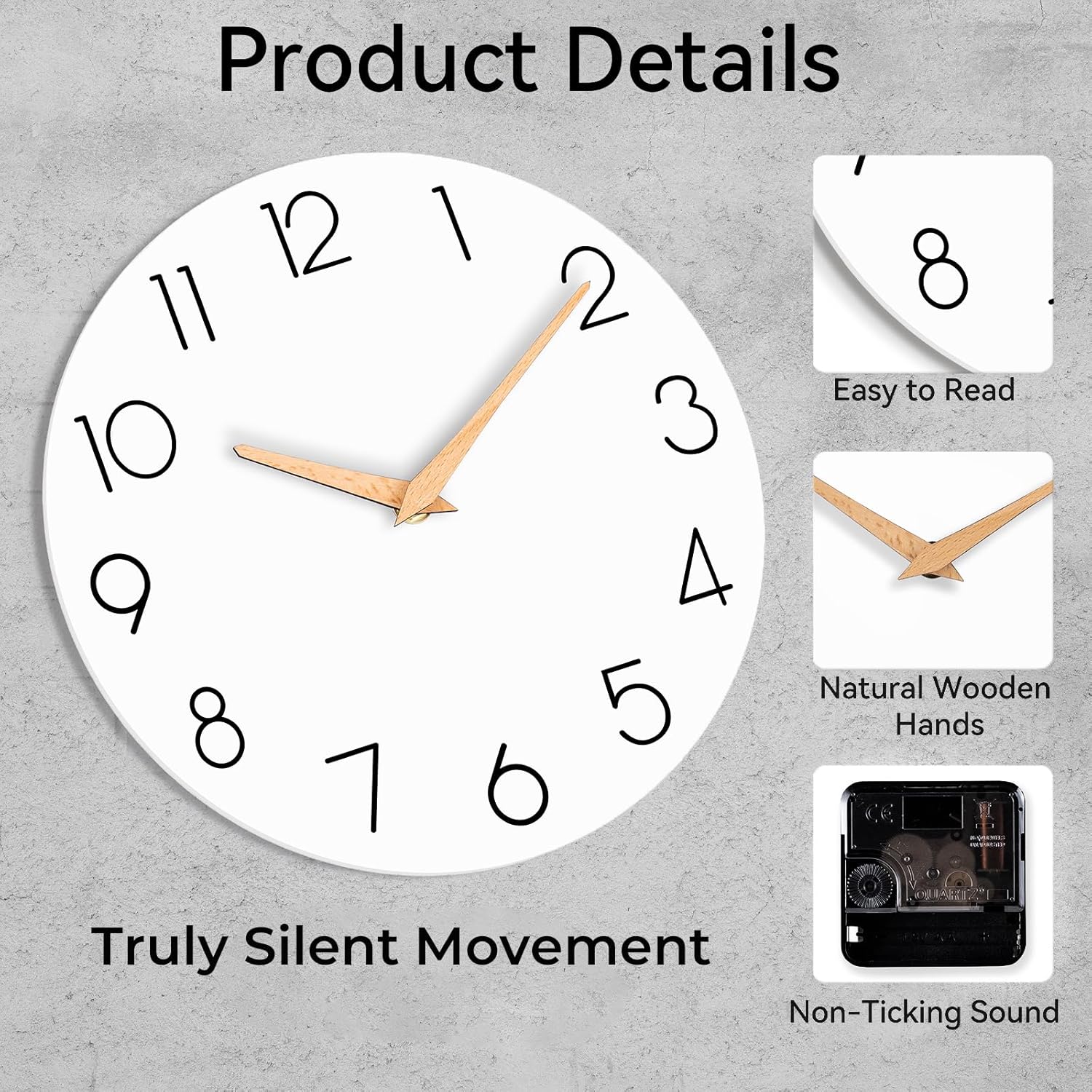 Wall Clock, 16 Inch Wooden Battery Operated Wall Clocks Silent Non-Ticking, Decorative White Clock for Living Room, Bedroom, Kitchen, Home, Office, School, Hotel