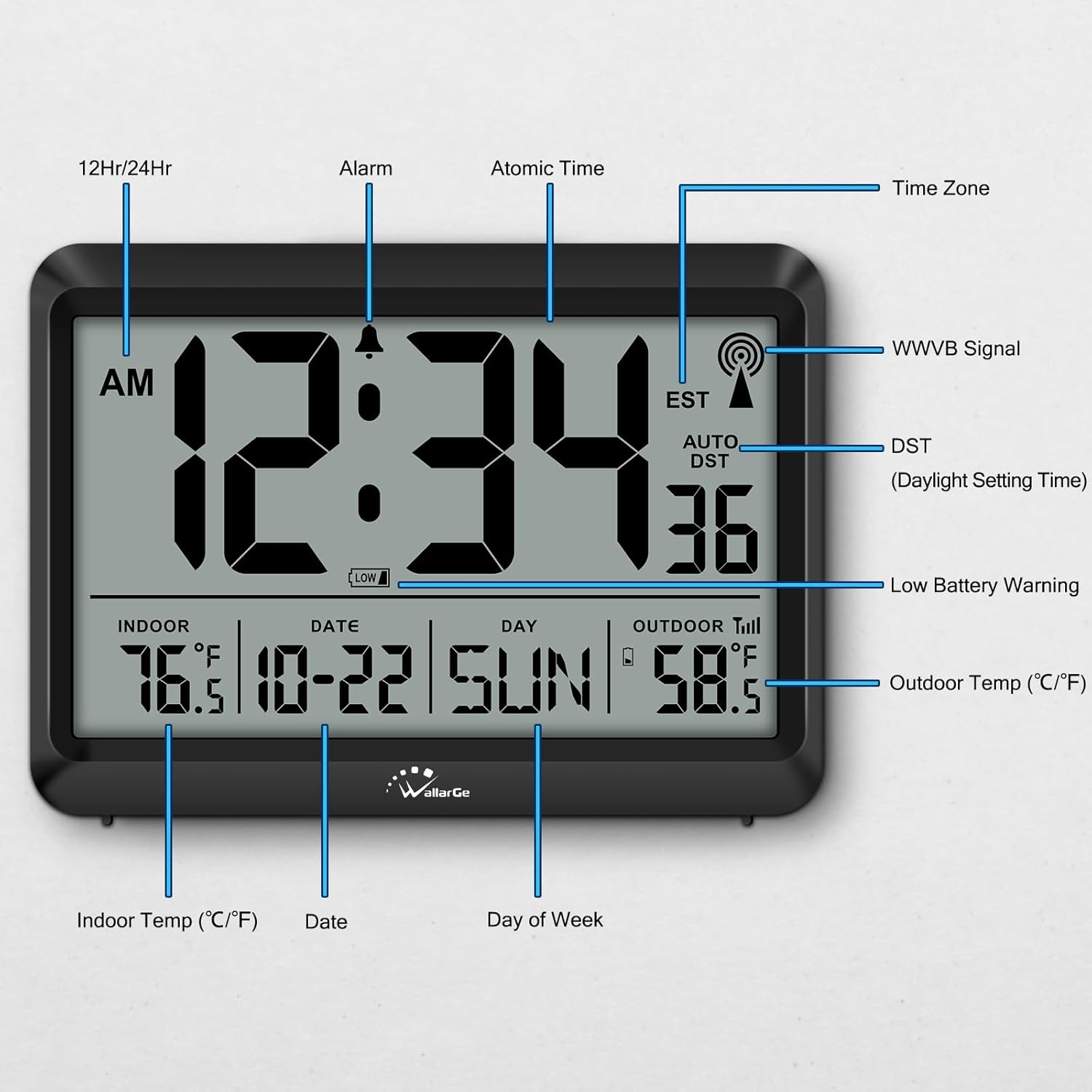 WallarGe Atomic Clock with Indoor Outdoor Temperature - 8.5'' Digital Clock Battery Operated, Self-Setting, 4 Time Zones, DST