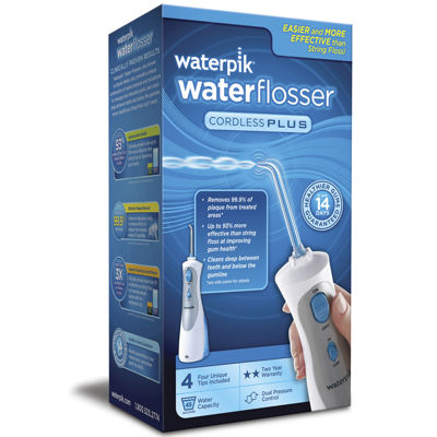 The Waterpik cordless plus water flosser is rechargeable and portable with an advanced dual water pressure control system that allows you to personalize your water pressure intensity. Featuring an ergonomic design, the Cordless Professional includes rechargeable batteries and an easy-to-fill reservoir.Effective plaque removal: clinically proven to remove up to 99.9% of plaque from treated areas in 3 secondsHealthier gums: clinically proven up to 50% more effective than traditional dental flossIdeal for implants: clinically proven up to 2x as effective for improving gum health around implants vs. string floss using the plaque seeker tipEssential for braces: clinically proven up to 3x as effective for removing plaque around braces vs. string floss using the orthodontic tipRemoves plaque and debris deep between teeth and below the gumline where brushing and traditional flossing can't reachMassages and stimulates gums to enhance circulation and keep your gums healthyLeaves your mouth feeling incredibly fresh and cleanPlastic and metal3.125x5x9"HCountry of Origin: Imported