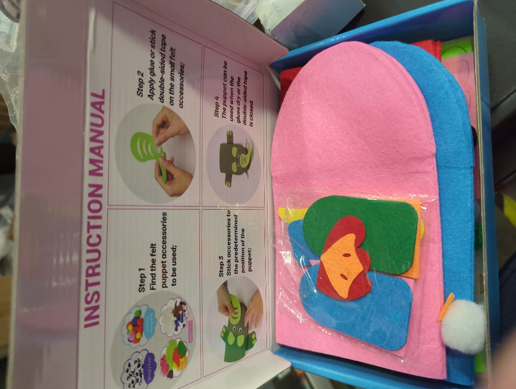 SUPER KIT - Package comes with 6 pcs colorful hand puppets, 1 bundle pompoms, 1 bundle googly eyes, 1 bundle felt decors and a paper box. Create your unique puppet in the world!