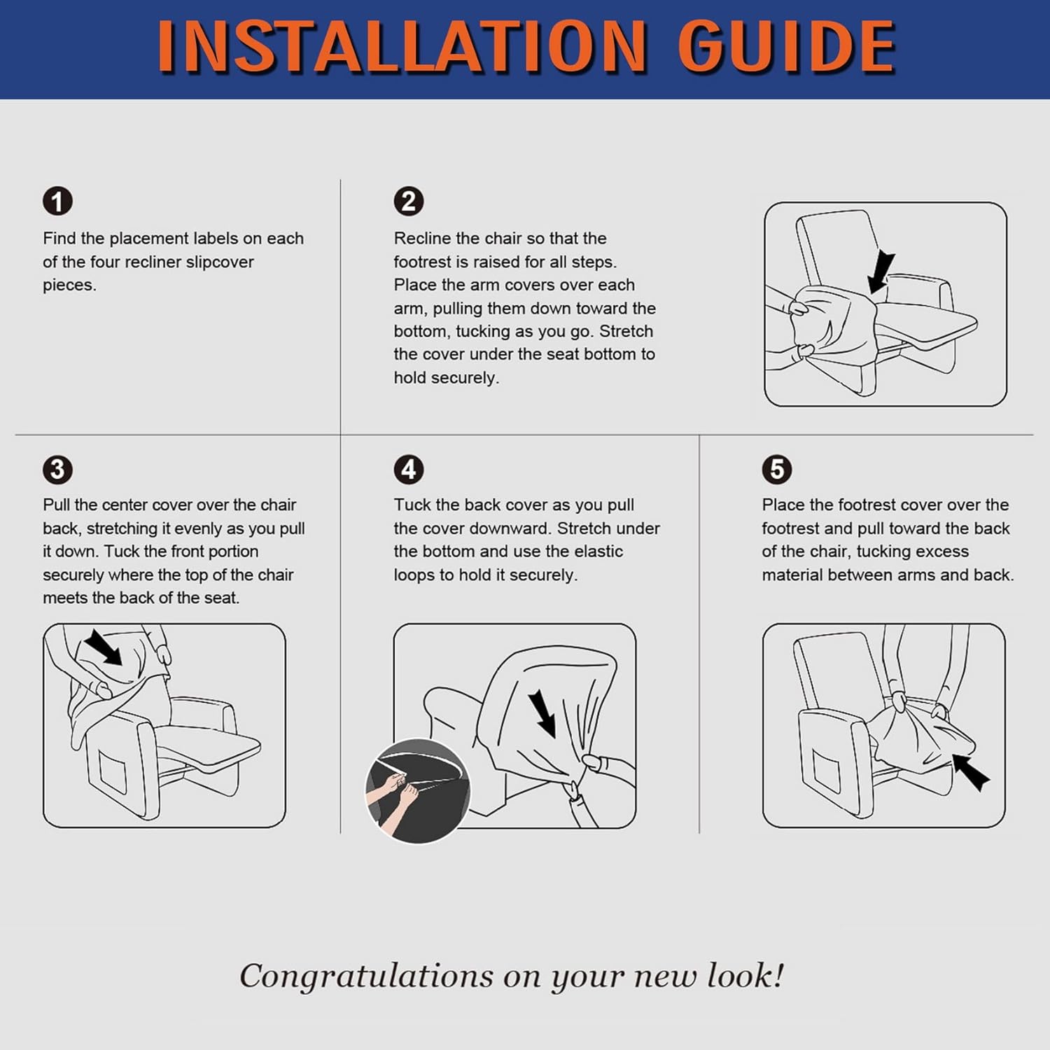 Effortless Installation for Instant Upgrade: Say goodbye to complicated installation processes. Our 4-piece set, including covers for the upper back, footrest, and both armrests, installs in minutes with the help of the included guide. It's as easy as slipping on a glove, transforming your recliner instantly.