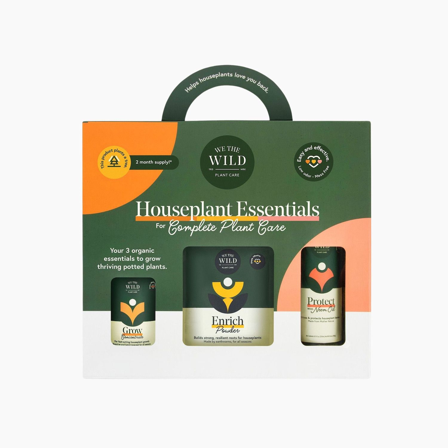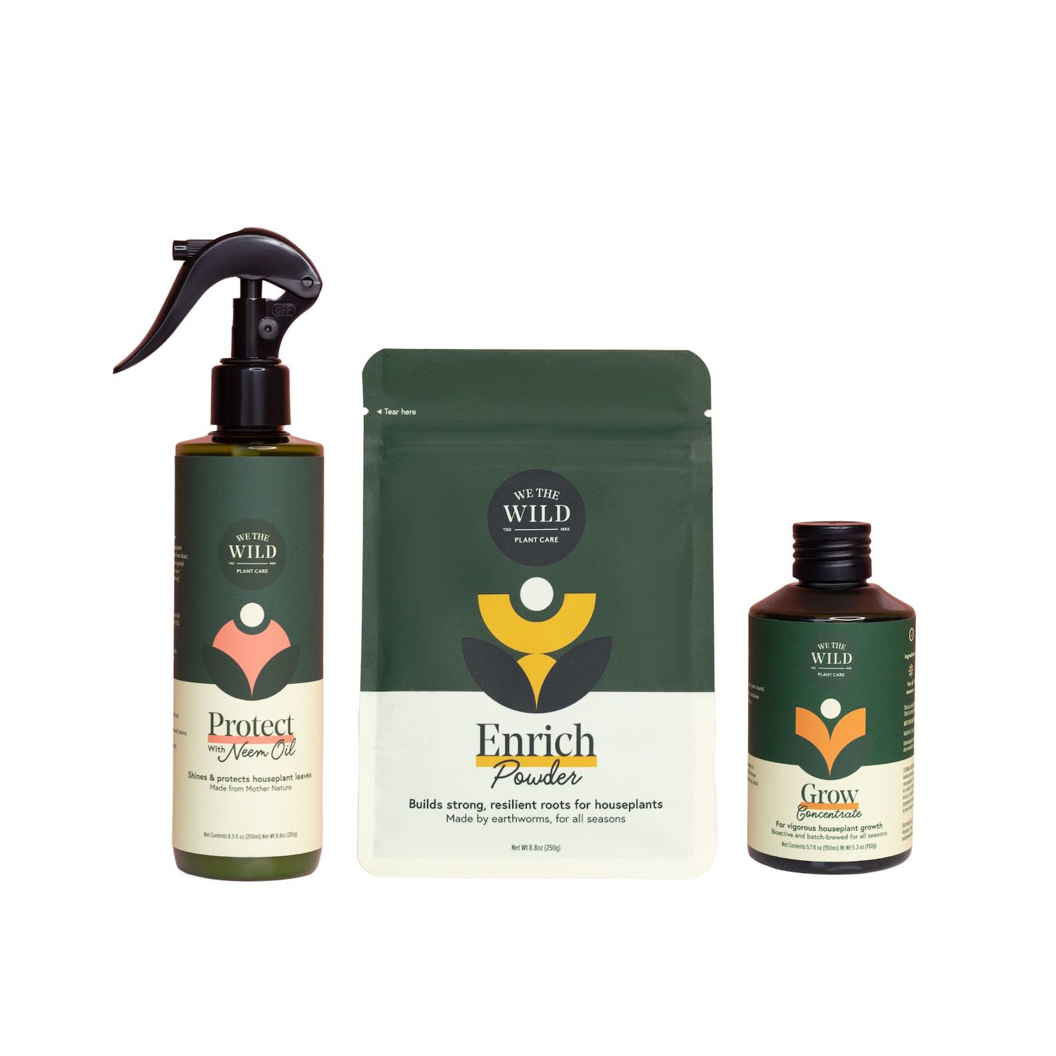Meet the brand. We The Wild's microbial plant care formulas are made from earthworms, not chemicals. Organic and easy to use, their products bring consumers a foolproof and eco-friendly way to care for their houseplants. Plants were born to be wild. Raise them that way. FEATURES Certified Organic 3 step, total plant care Trial Size Good for all plants Made by earthworms Certified Organic WHAT'S INCLUDED Bottle (8.5 oz) of Protect Spray, 5.1oz Grow Concentrate bottle, Enrich Powder (14 oz.) pack DETAILS 10.24"H x 11.42"W x 3.11"D Weight: 33.16-oz. Earthworm Castings Imported