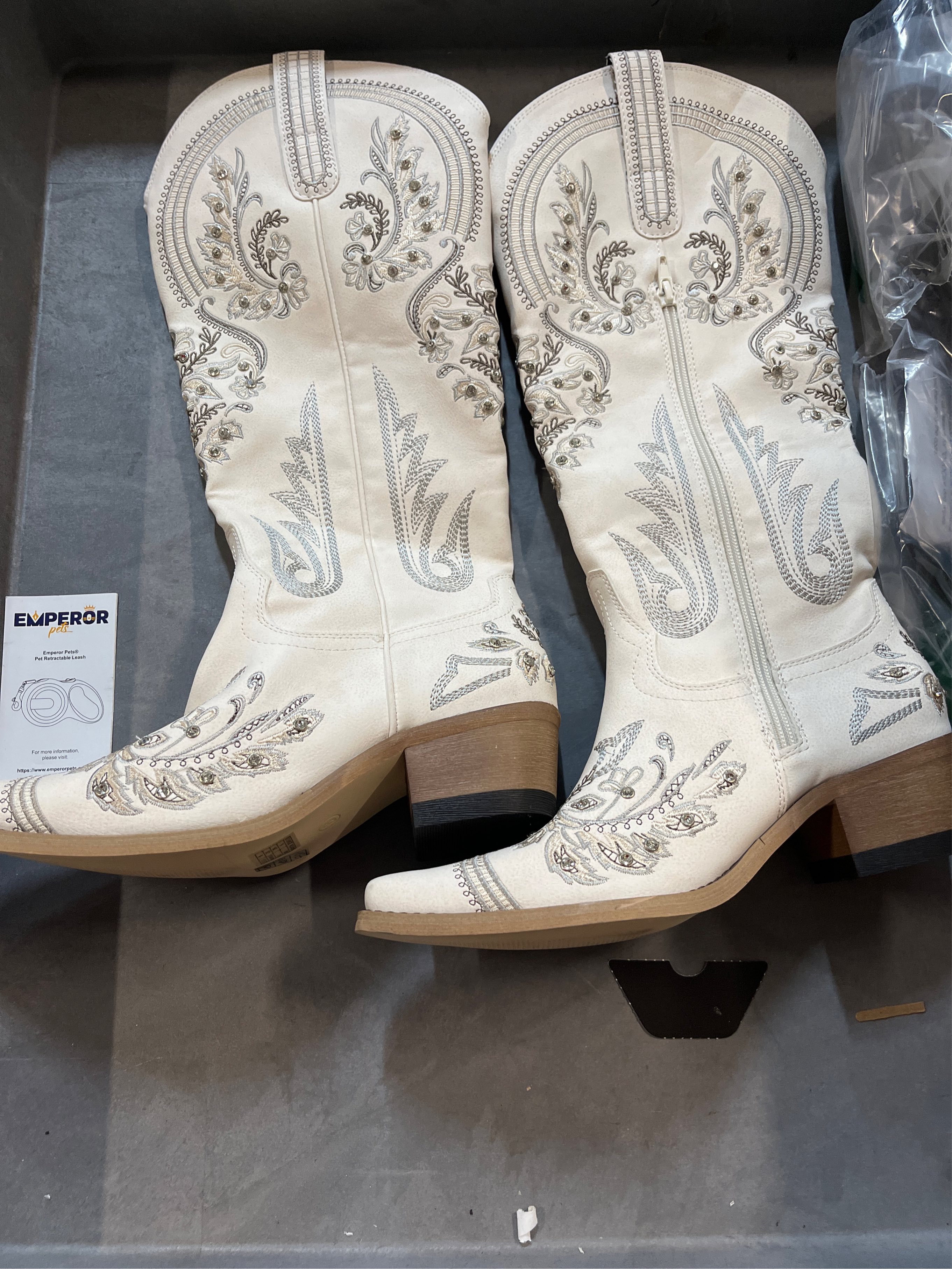 Western Cowboy Boots for Women Embroidered Rhinestones Knee High Cowgirl Boots Pointed Toe Chunky Heel Fashion Retro Classic Tall Boot SIZE 8