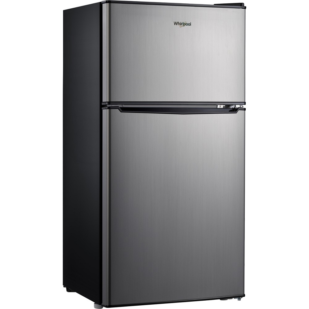 Whirlpool 4.0 cu ft Refrigerator WH40S1E - Stainless Steel. Mini fridge. Energy Star. Reversible door. 68.34 lbs. Perfect for additional kitchen space, dorm rooms, or lower-level family rooms. Features five-can dispenser and 2-liter bottle door storage. Recommended cabinet clearances: 2" per side, 0.5" top, and 2" back.