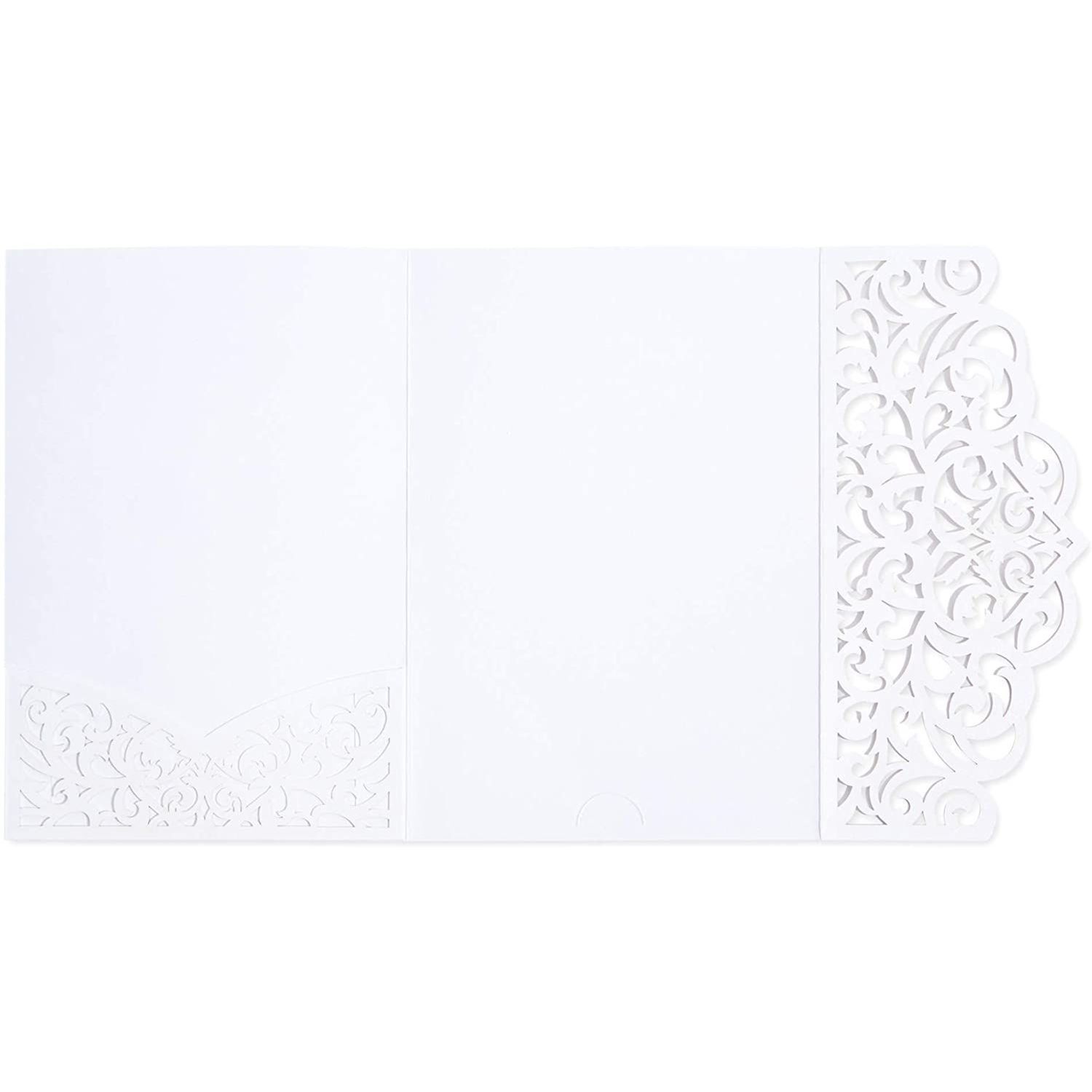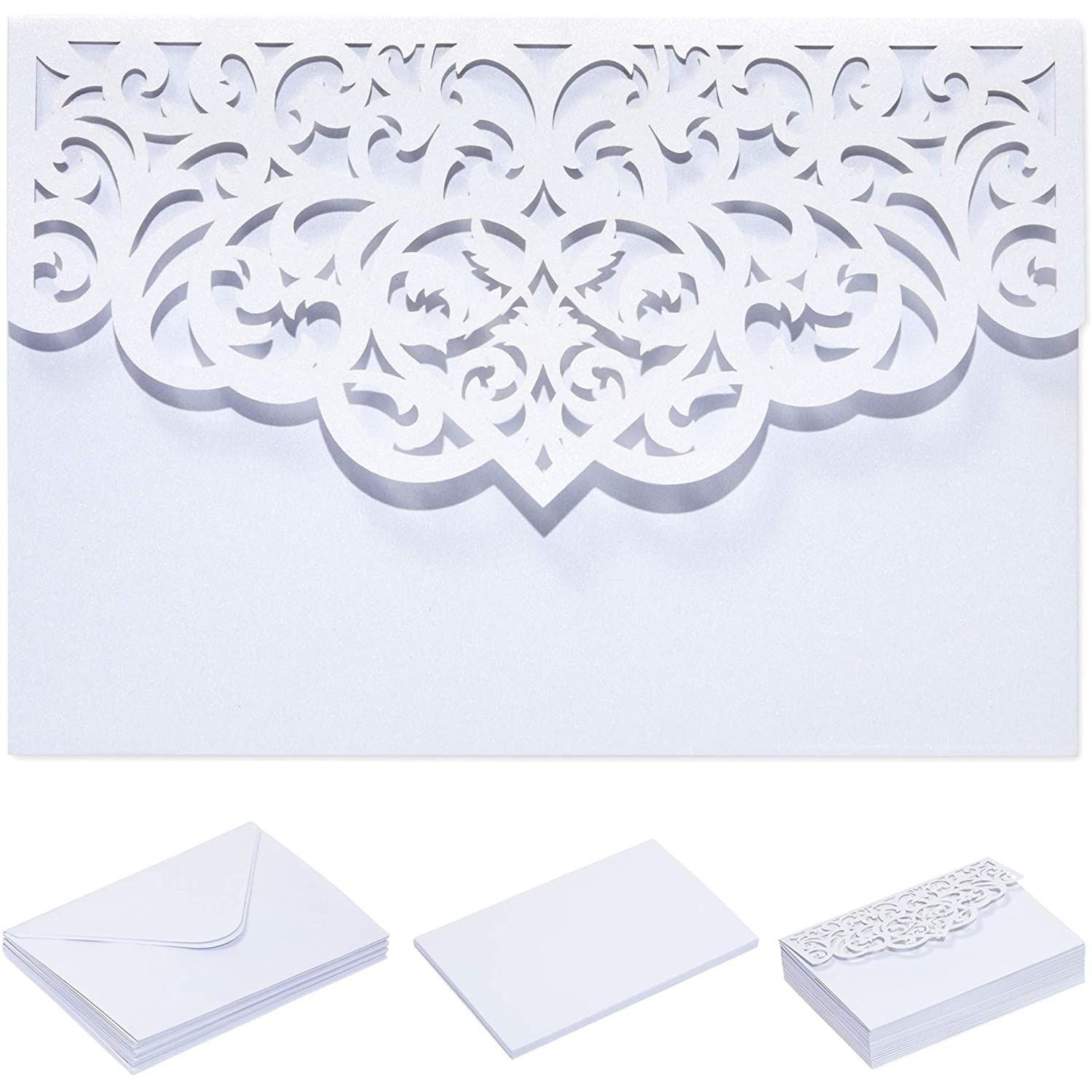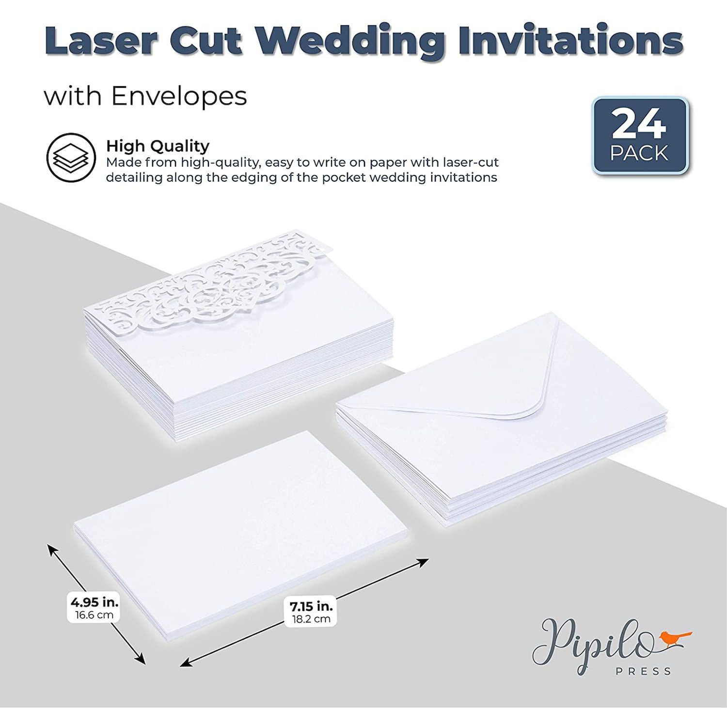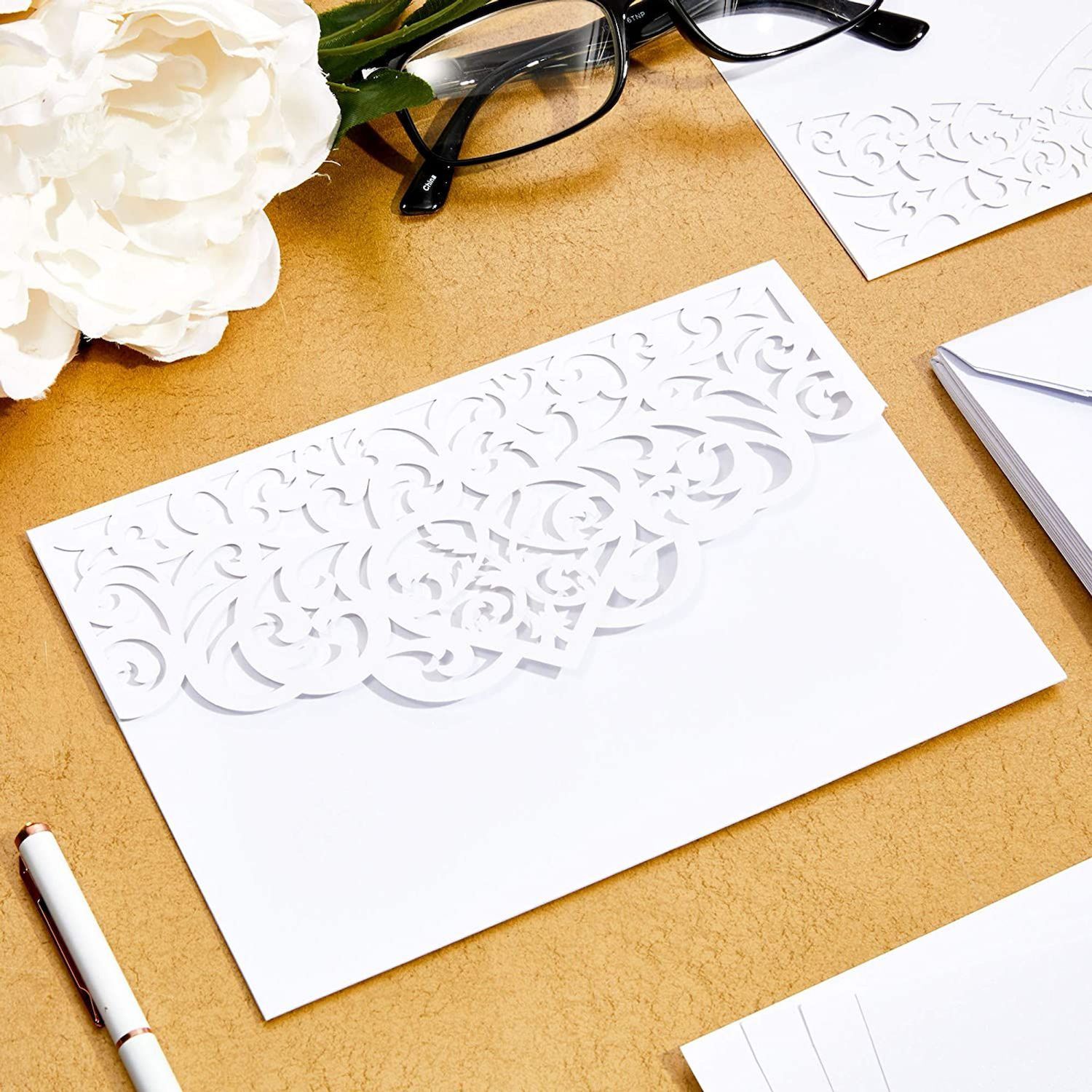 - Dimensions: Each white envelope and laser cut invitation pocket measures 7.15 x 4.95 inches add ribbon, lace, or twine to embellish and secure your invitation cards in place