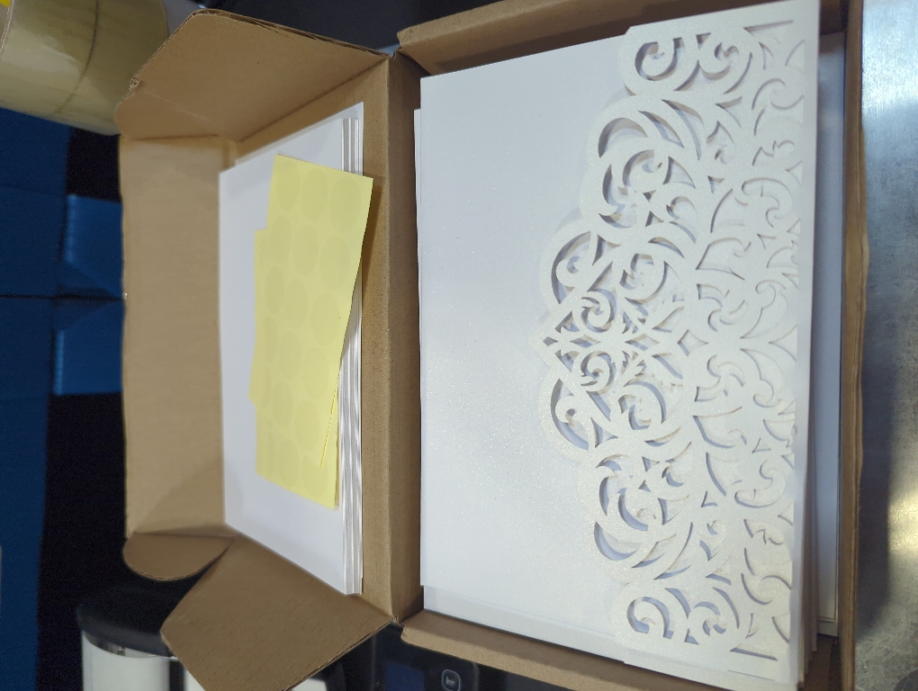 - Card: 250g coated with Laser cutting Insert Sheet: 180gsm Envelope:100gsm uncoated Clear stickers on one sheet, PVC