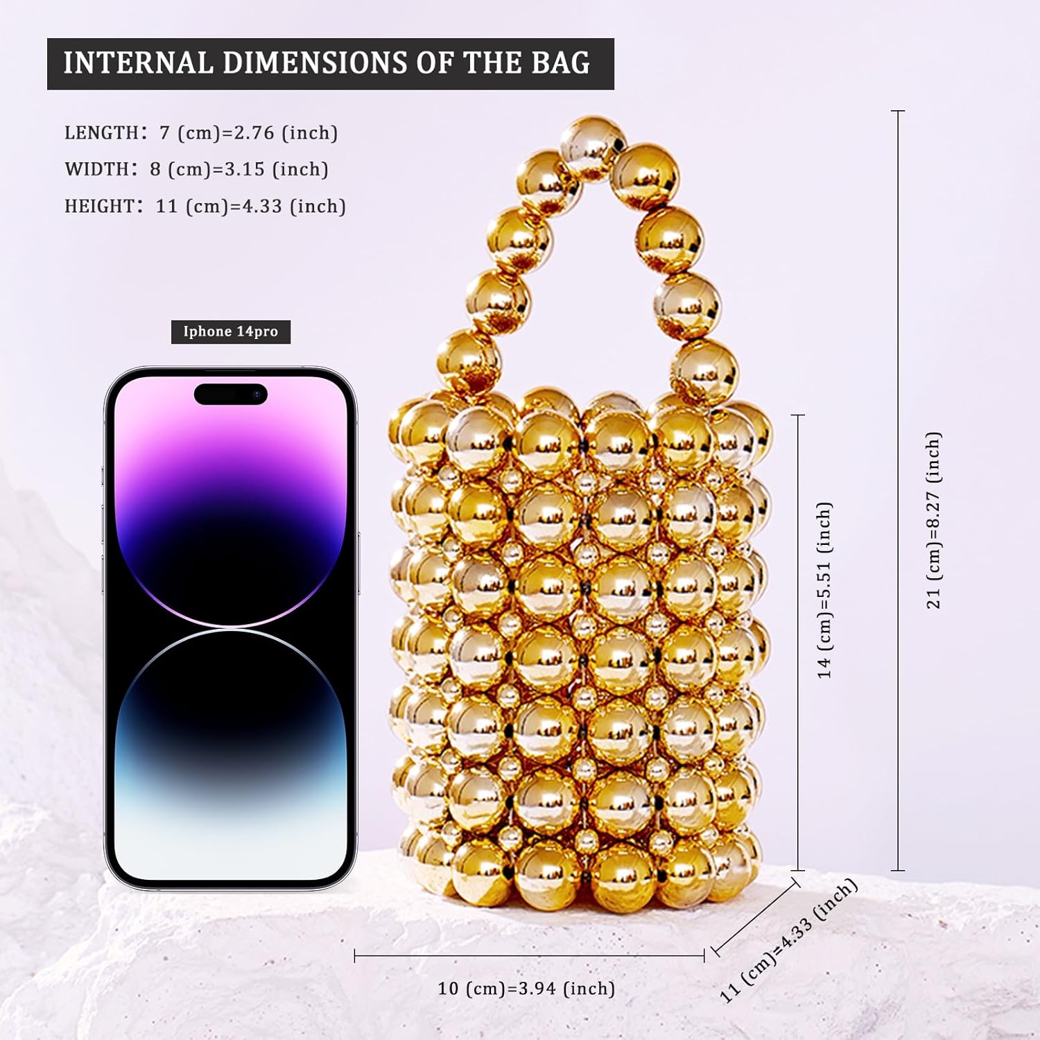 The dimension of this clutch purse is 9*3.9*3.5(L*W*H)inch, perfectly keep your party necessities, such as mobile phone, lipsticks, keys
