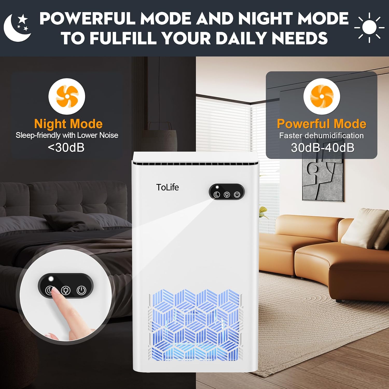 TWO DEHUMIDIFIER MODES: The dehumidifiers for home offers a powerful mode that efficiently reduces humidity, allowing for quick and effective moisture elimination. It also features a low-speed sleep mode for quiet operation (< 30 dB) while you sleep