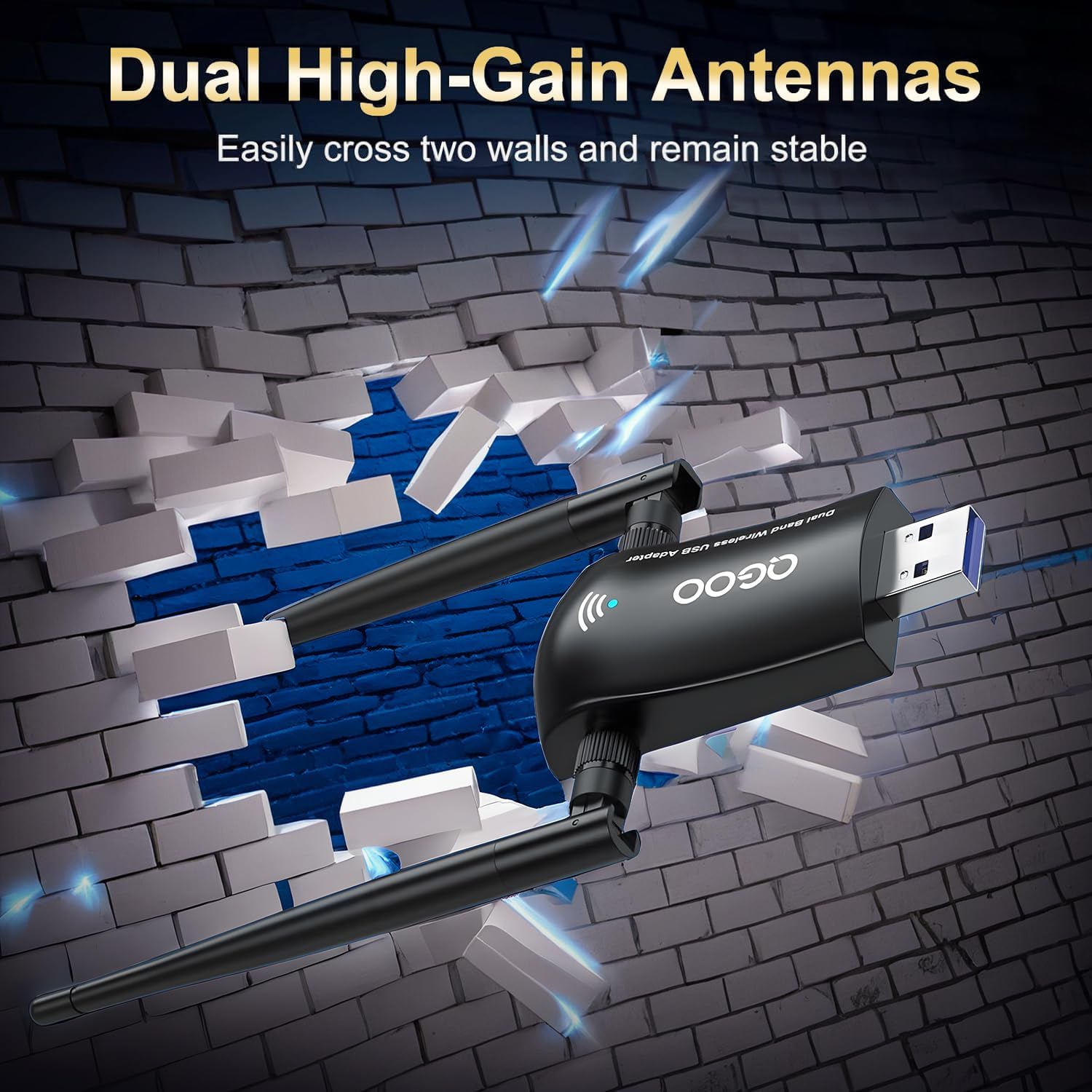 WiFi Adapter for Desktop PC, QGOO Wireless AC1300Mbps USB 3.0 Network Dongle with 5dBi High Gain Dual Antennas, 2.4GHz/5GHz Dual Band for Laptop Computer Compatible Windows11/10/8/7