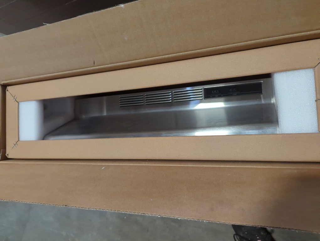 New open for inspection....Installs as non-ducted only with charcoal filter included. Replaceable mesh charcoal filter removes smoke and grease. Accommodates up to 50-watt cooktop lighting (bulb not included). Hardwire electrical connection. Rocker type control for both light and fan for easy operation, 2 speed fan. 30 Range hood, dimensions: 29.8 in. (W) X 17.7 in. (D) x 6.1 in. (H)
