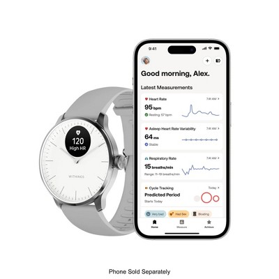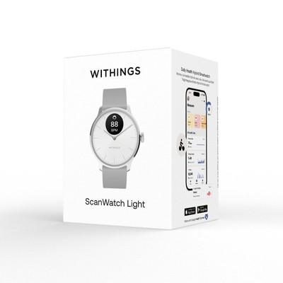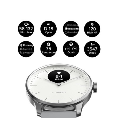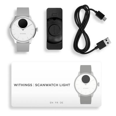 Features: Black (band) Weight: 27.1 Grams Product Model: Withings ScanWatch Water Resistance: Water-Resistant Connection Type: No Wired Connection Ports Material: Watch Band: Fluoroelastomer Includes: USB Cable, Charging/Docking Station, Battery Charger Operating System Compatibility: Android, Apple iPadOS, Apple iOS Wireless Technology: Bluetooth Screen Size: 37 Millimeter Activities tracked: Basketball, Tennis, Baseball, Yoga, Cycling, Skiing, Soccer, Elliptical Training, Rowing, Walking, Weights, Running, Pilates, Football, Climbing Maximum Battery Charge Life: 30 Days Metrics Measured: Sleep Interruptions, Total Steps, Sleep Stages, Calories Burned, Active Minutes, Sleep Duration, Sleep Quality, Heart Rate Material: Stainless Steel Battery: 1 Non-Universal Lithium Ion, Required, Included