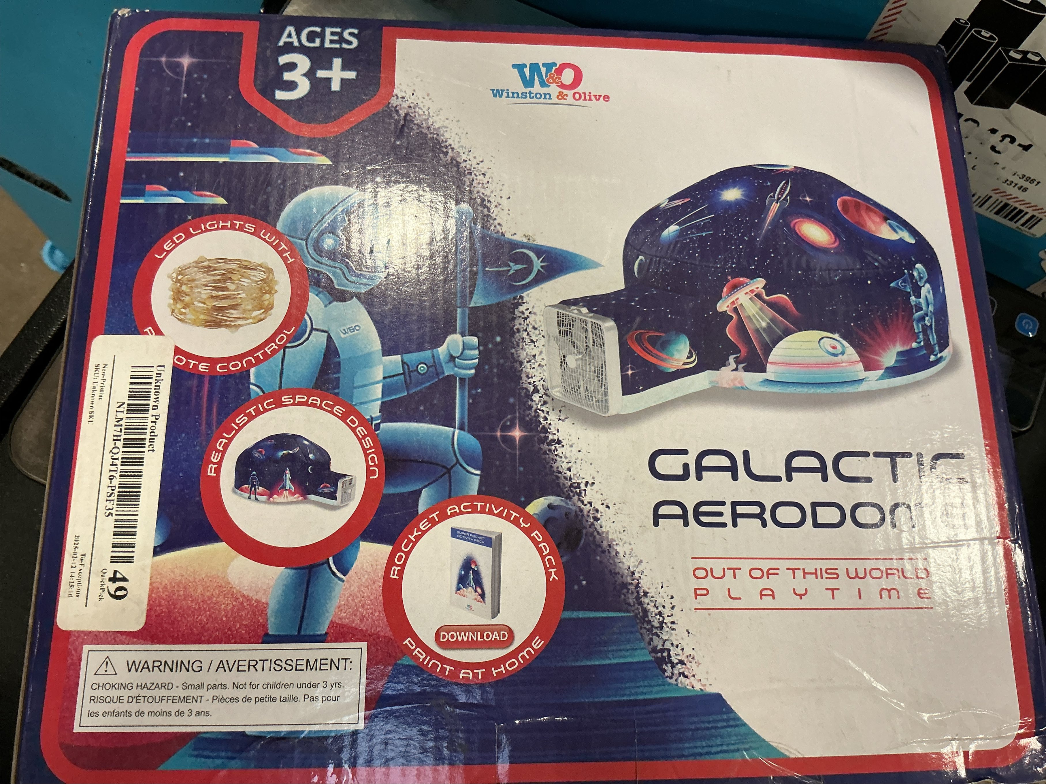 - With a special kids fort tunnel - little hands will never come near the fan. Our US Patent on the unique shape of the indoor playhouse allows for effortless setup in seconds. Kids can enter their private airspace with no wait time. (FAN NOT INCLUDED) - Night or day they’ll always want to play! The Winston and Olive space tent comes with LED lights that change to eight different modes with a remote control. Let your kids customize the vibe for even more magical playtime.- Innovative weights on the bottom of the tent ensure that the Galactic Aerodome stays grounded at all times! Little astronauts can enjoy uninterrupted play even when blasting off into intergalactic space adventures.- Our Award Winning Aerodome is easy to set up, spacious ( Circumference- 236 inches, Height- 57 inches) and most importantly safe and breathable. With the Galactic Aerodome, your child will engage in endless imaginative adventures!
