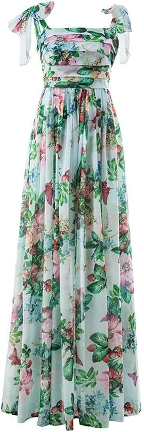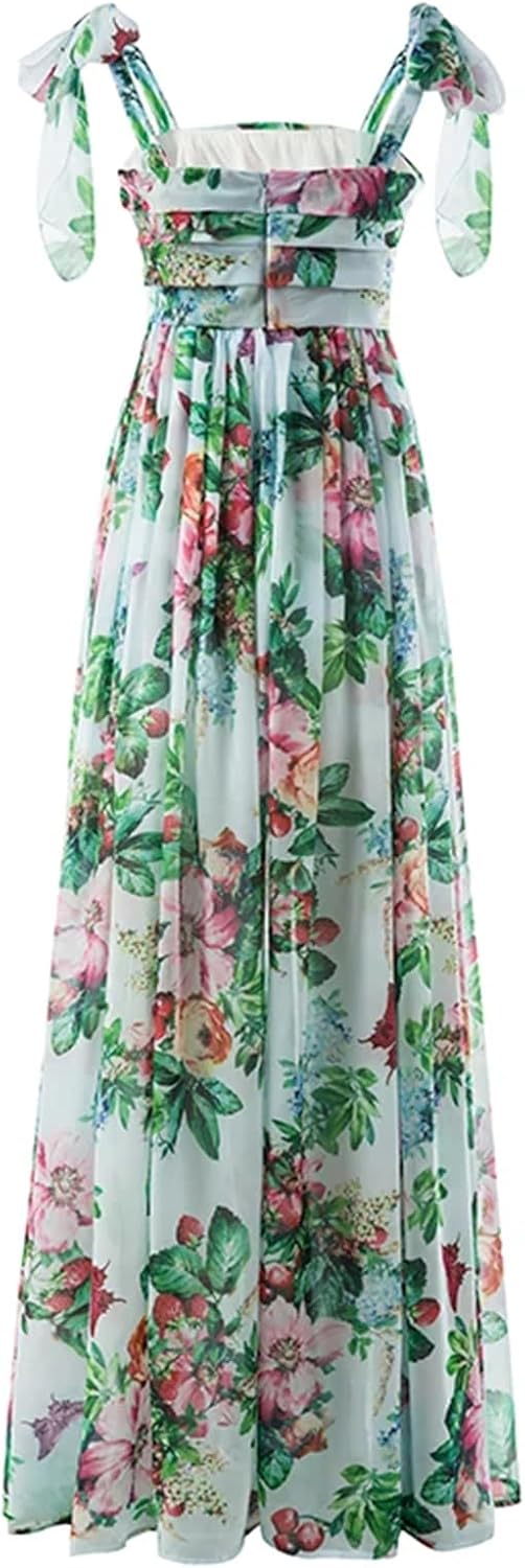 Women Size 12 Backless Flower Long Dress Bow Straps High Waist Pleated Beach Dress Chic Large Swing Sundress