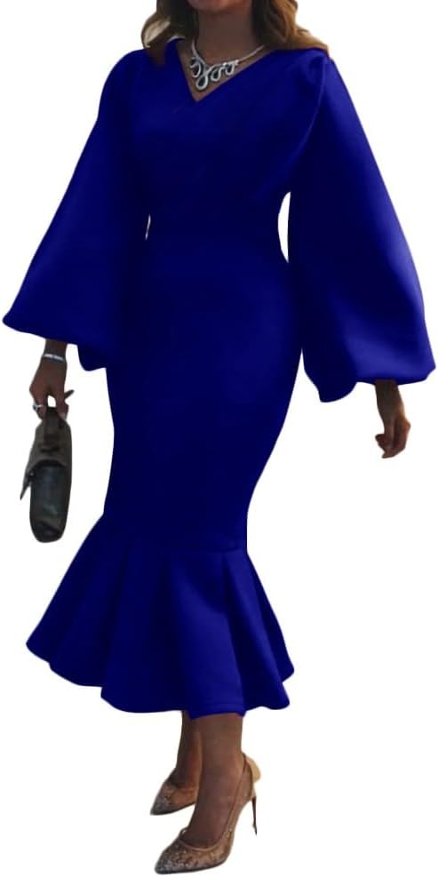 Women's 3XL Sexy V Neck Mermaid Fishtail Dress Elegant Lantern Long Sleeve Solid Color High Waist Bodycon Maxi Dress