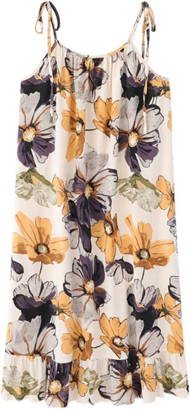 Women's Cotton Nightgown Cute Printed Sleeveless Pajama Dress Ruffle Frilly Knee Length Midi Chemise Comfy Pjs