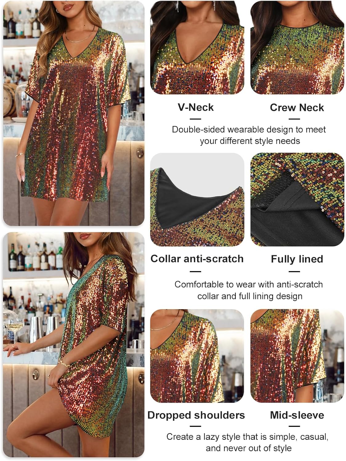 Women's Crew Neck Sequin Dress for Women Sexy V Neck Shirt Dress Sparkly Half Sleeve Loose Party Club Cocktail Dress