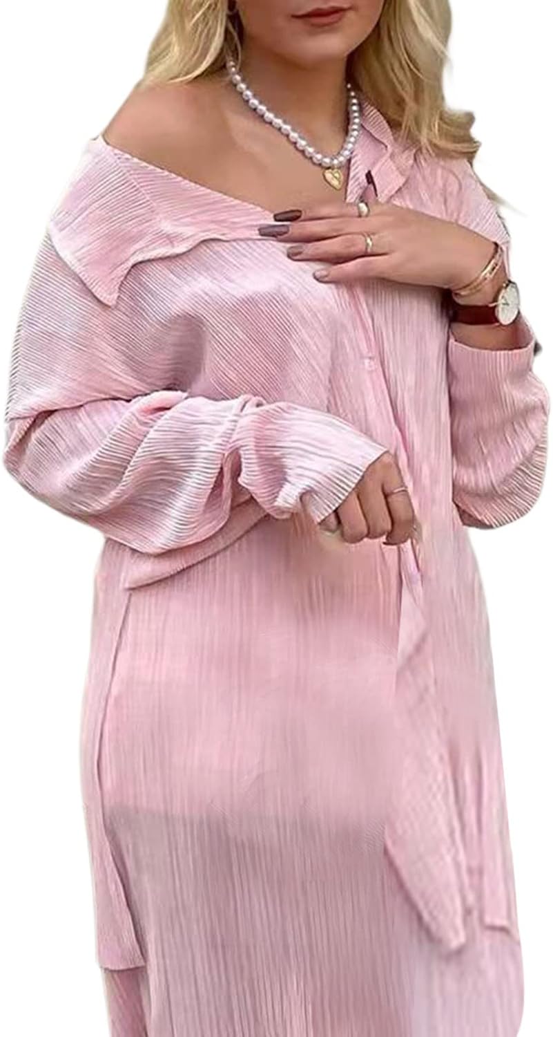 Feature: Loose fit, solid color. Shirt: long sleeve, turn down collar, button closure. Pants: elastic waistband, wide leg. Easy to put on and take off.