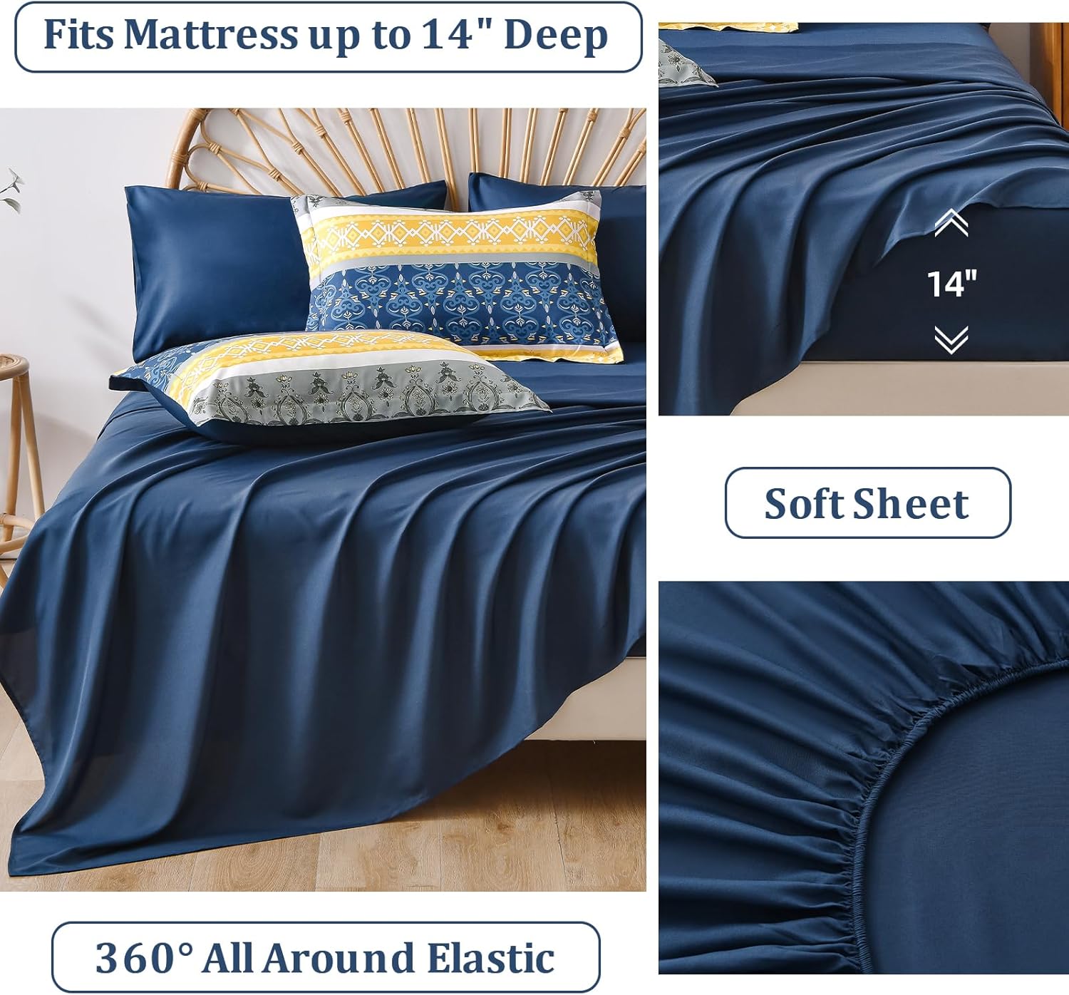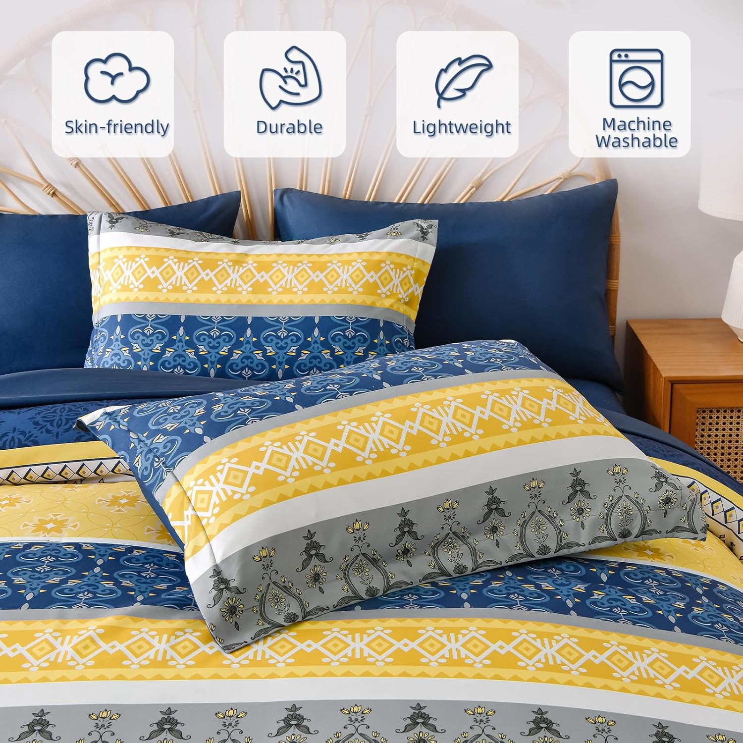 3. WONGS BEDDING Boho Comforters Set Queen, 7 Pieces Navy Blue and Yellow Comforter Sets Bohemian Bed in a Bag Striped Comforter Set Soft Microfiber Paisley Floral Comforter and Sheet Set for All Season
