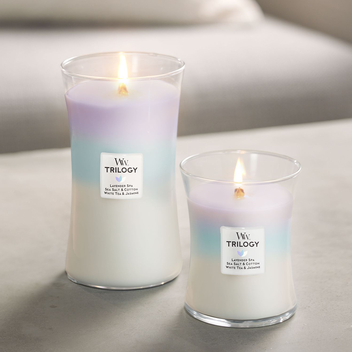 Lavender spa, sea salt & cotton, and white tea & jasmine fragrances blend perfectly to produce a relaxing aroma. PRODUCT FEATURES Pluswick Innovation wooden wick creates soothing crackling sound Flared design creates a wider opening for a more consistent fragrance experience Note: only has one scent throughout all colors of the candle PRODUCT DETAILS Dimensions: 3.88"L x 3.88"W x 4.5"H 9.7-oz. Paraffin and soy waxes Wooden wick Burns up to 65 hours Wipe clean Flared design creates a wider opening for a more consistent fragrance experience