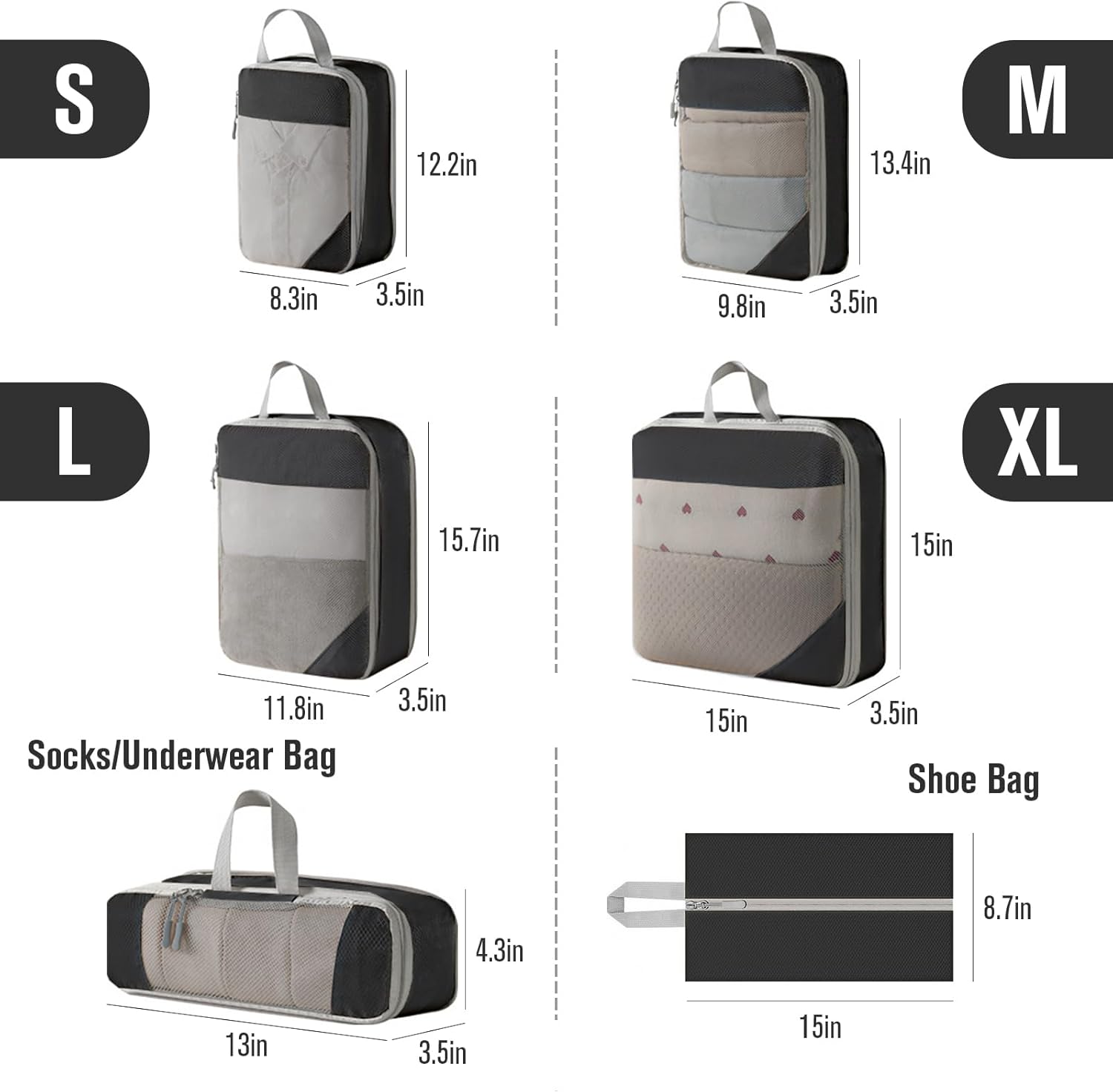 WOOMADA Compression Packing Cubes for Suitcases Travel Essentials 6 Set Rectangle Mesh Expandable Travel Bags Organizer for Luggage