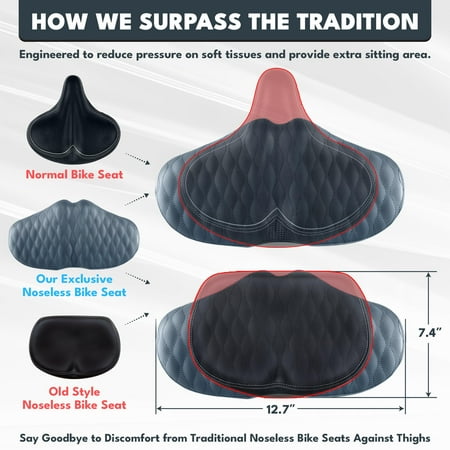 [Revolutionary Comfort] - Experience the end of ‘numb-bum’ with our patent pending noseless bike seat! It's engineered to reduce pressure on soft tissues, ensuring a comfortable, pain-free ride! [WING Shape Wonder] - Our patented WING Shape design significantly extends contact surfaces, reducing pressure. 7.4” (L) x 12.7” (W) x 5.3” (H) gives lots of surface area. Take control of your cycling journey with no compromise between comfort and long rides. [Widespread Compatibility] - Our U.S. unique noseless bike seat is compatible with many types of bikes, including city, electric, stationary, Peloton, mountain and road bikes. [Rugged Resilience] - Features a rail design that scoffs at the idea of 'normal'. Built for the heavyweight champ of cycling, it's the bouncer at the bike-seat club, robust and resilient! [Zero Slippage] - No sliding off our noseless bike seat! It's the ultimate seatbelt for your bottom, ensuring you're firmly planted for your journey. We make it right for your ride!