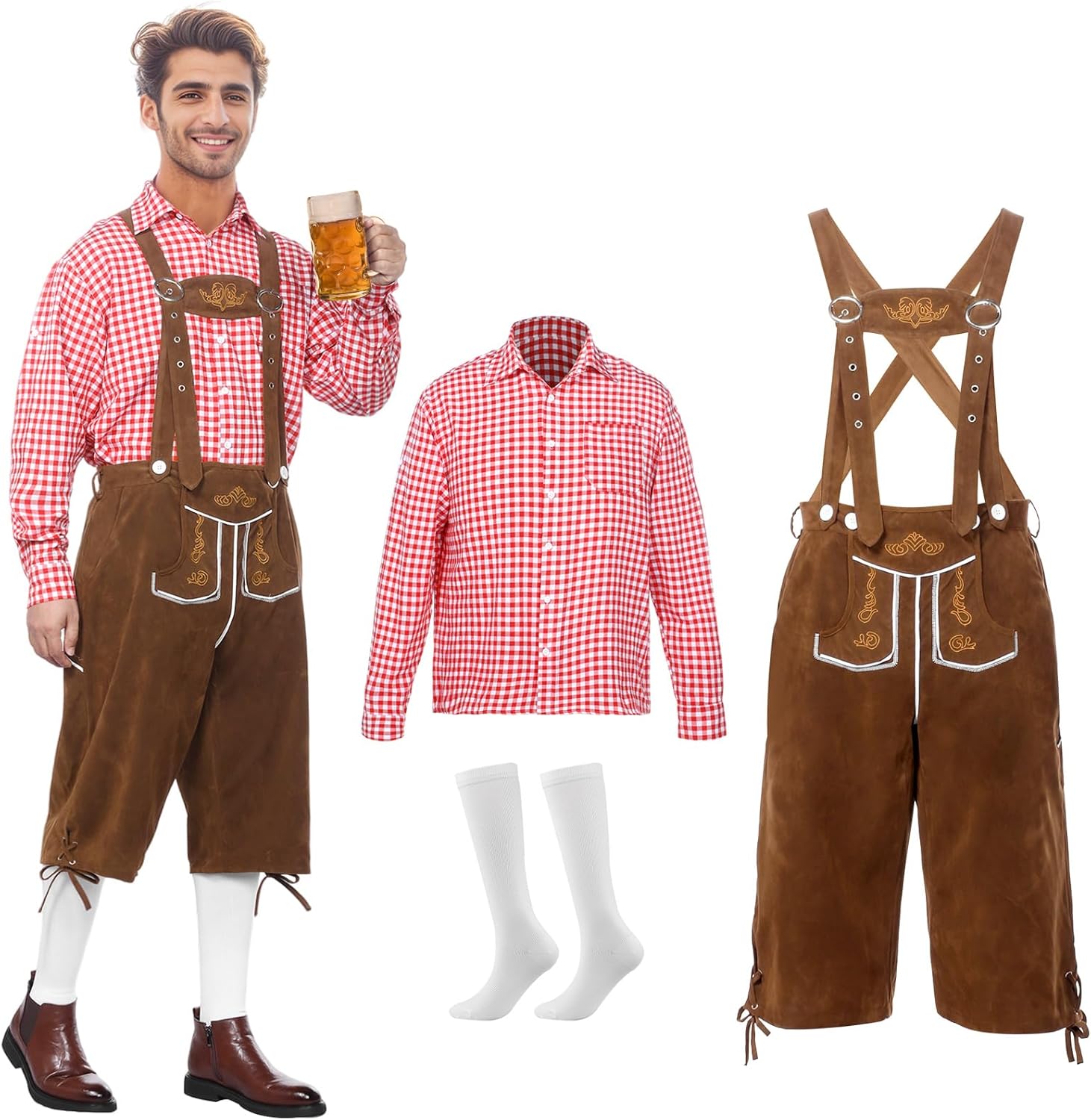 Authentic Bavarian Design: Inspired by traditional Bavarian attire, our Oktoberfest outfit features a classic plaid shirt paired and coffee-colored lederhose intricate embroidery detailing. Ideal for portraying a traditional and authentic Oktoberfest look, this men’s German Bavarian Oktoberfest costume set will make you feel like a true Bavarian at any Oktoberfest celebration.