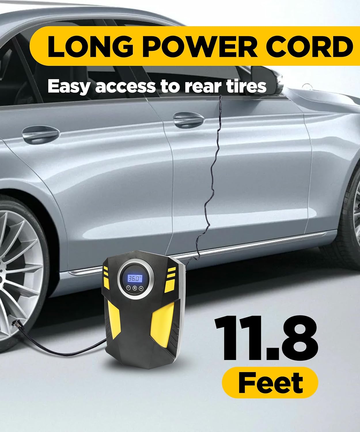 [Automatic Shutdown] The portable air compressor is based on the automatic shutdown function, providing you with a reliable user experience. Set the required pressure level and start the inflation operation. When our car tire inflator reaches the required pressure, the car air compressor automatically turns off, so you don't have to worry about over inflation.