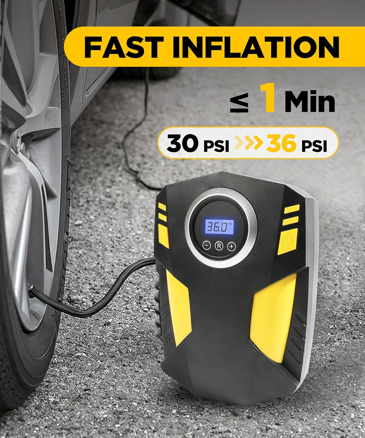 YAKEFLY Tire Inflator Portable Air Compressor,12V DC Car Tire Pump with Digital Pressure Gauge,150 PSI Auto Shut Off with Emergency LED Flasher,Air Compressor Tire Inflator