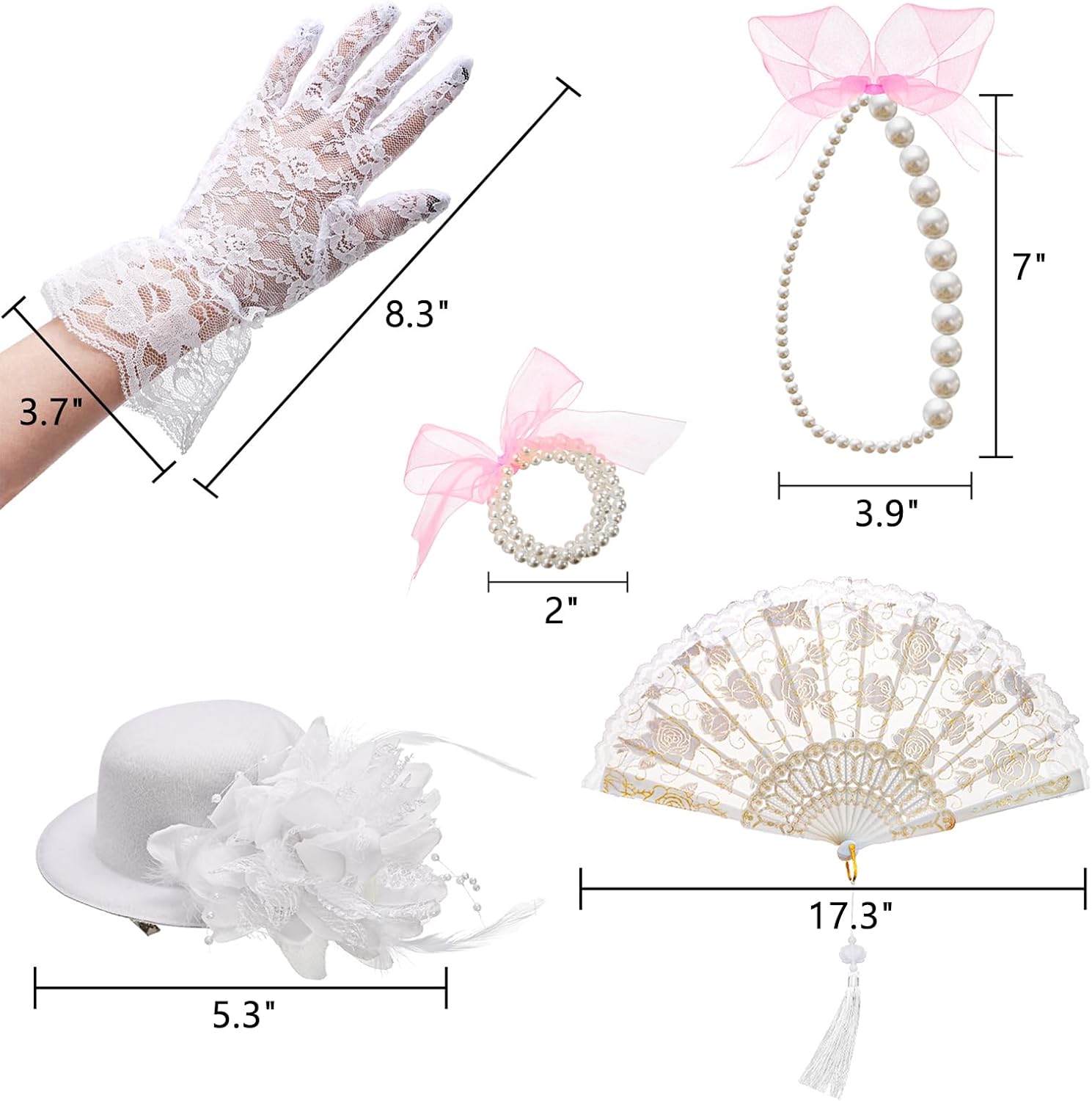 High Quality Material: The hat is made of polyester fiber. Gloves are made of lace fabric. The fan is made of plastic and lace. Necklace and Bracelet are made of plastic. The adorable dress up set make little girl to be a elegant and fashionable little lady.