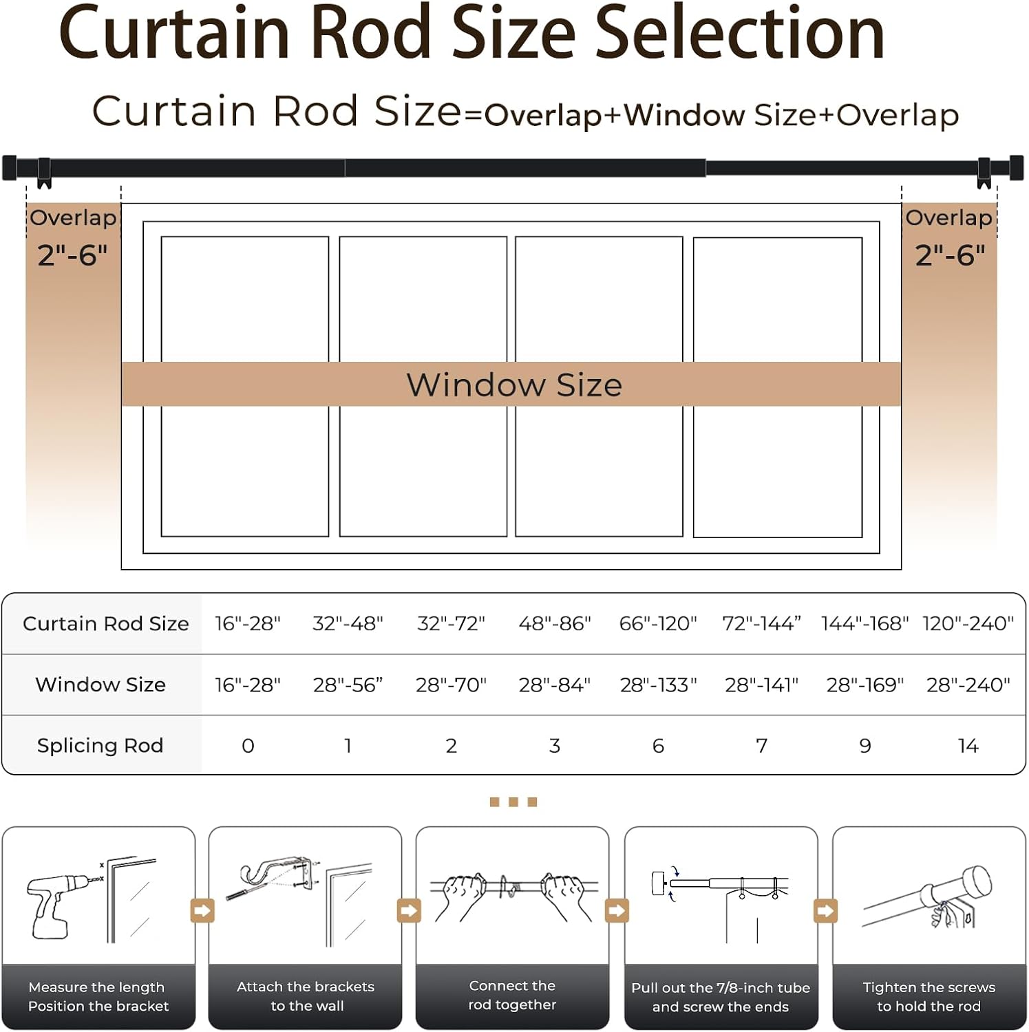ADJUSTABLE & VARIOUS SIZES: Up to 144 inches (12 ft) long. After installing rods A and rod C, you can adjust the length through the telescopic rod inside rod B to fit windows of different sizes. We offer a choice of eight sizes from short to extra-long curtain rods. Because of wide range of sizes, you can decorate these adjustable curtain rods indoors, such as living room, bedroom, kitchen, study, or install them outdoors, such as terrace, patio, pergola...