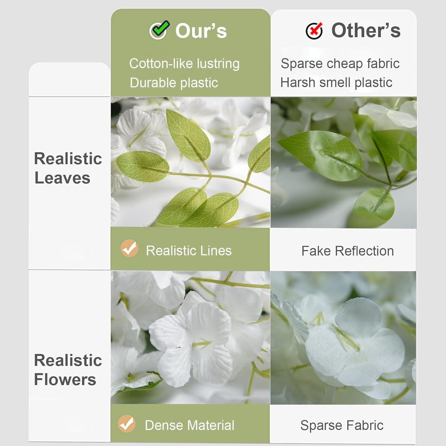 【More Realistic, Fuller & Thicker Flowers】-- Our 2024 Upgraded version of artificial hanging wisteria is meticulously crafted, capturing the essence of real white wisterias with remarkable details. We add clear and exquisite lines to the flowers and leaves to make it look more realistic, select thicker branches with a total of 1800 blossoms in this 4-pack bundle, 2X fuller than other hanging wisteria flowers on the market.