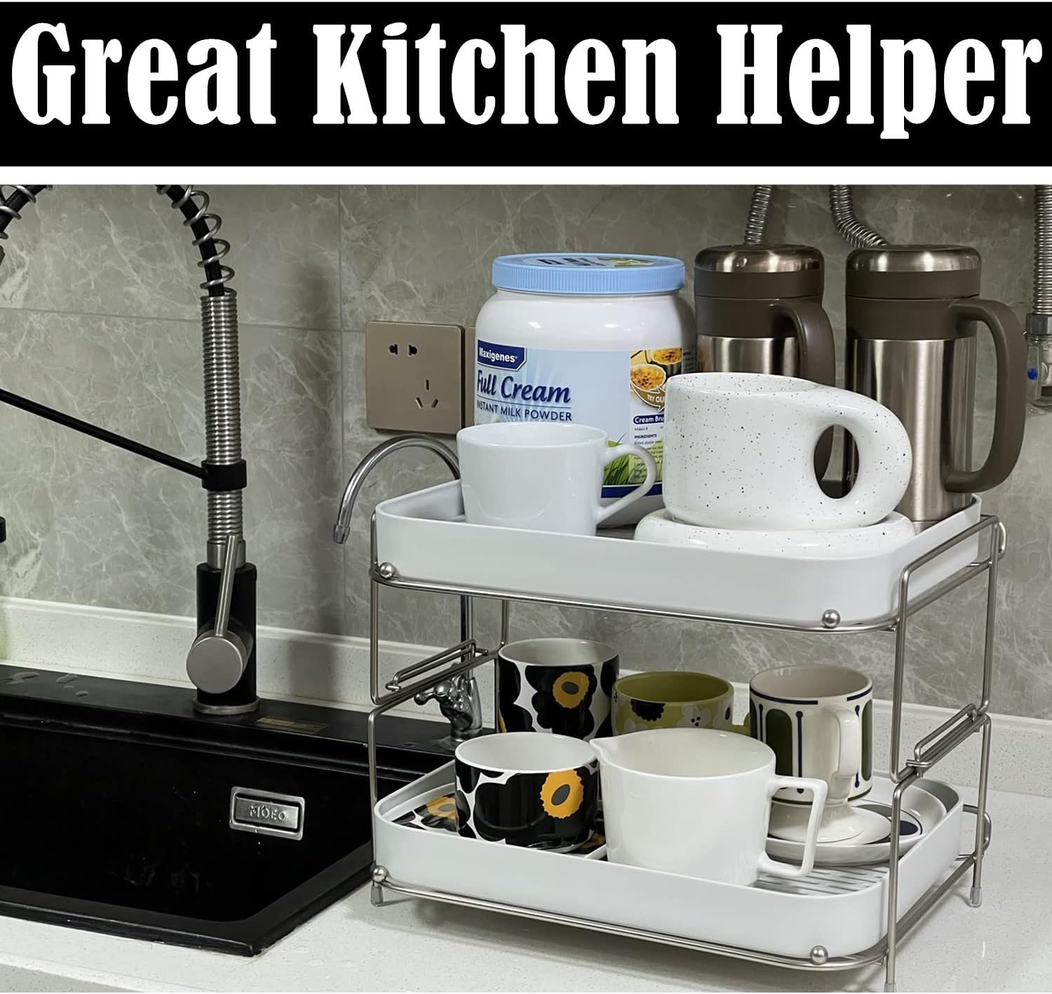 2. This rack has multiple functions to store things, including mugs, cups and bowls. It can also be used to organize fruits, vegetables and snacks.